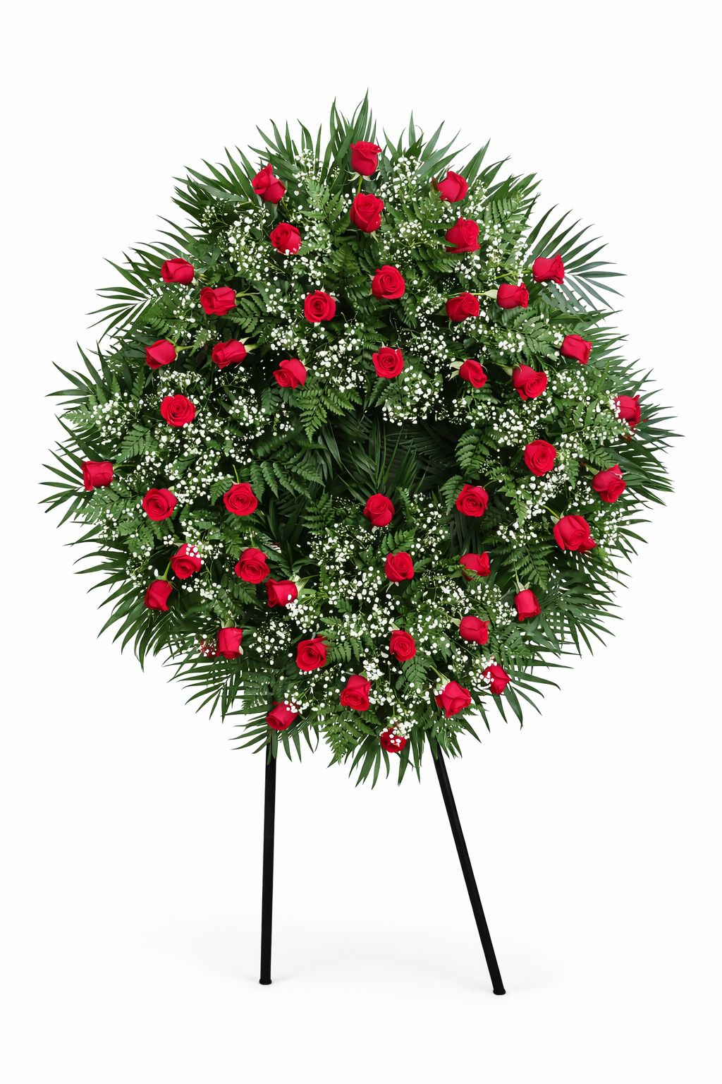 Corona funeraria elaborada con 50 rosas frescas, símbolo de amor y respeto. Envío urgente a tanatorio en Valencia con cinta personalizada.